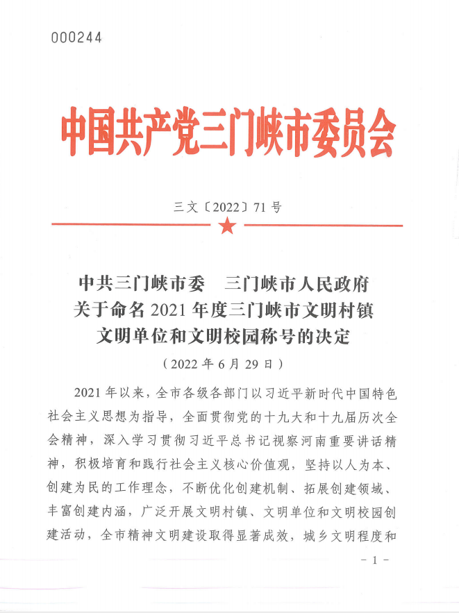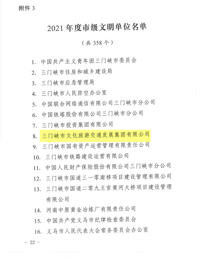 近日,三門峽市委、市政府印發《關于命名2021年度三門峽市文明村鎮、文明單位和文明校園稱號的決定》(三文〔2022〕71號),市文旅集團榮獲“2021年度市級文明單位”稱號。