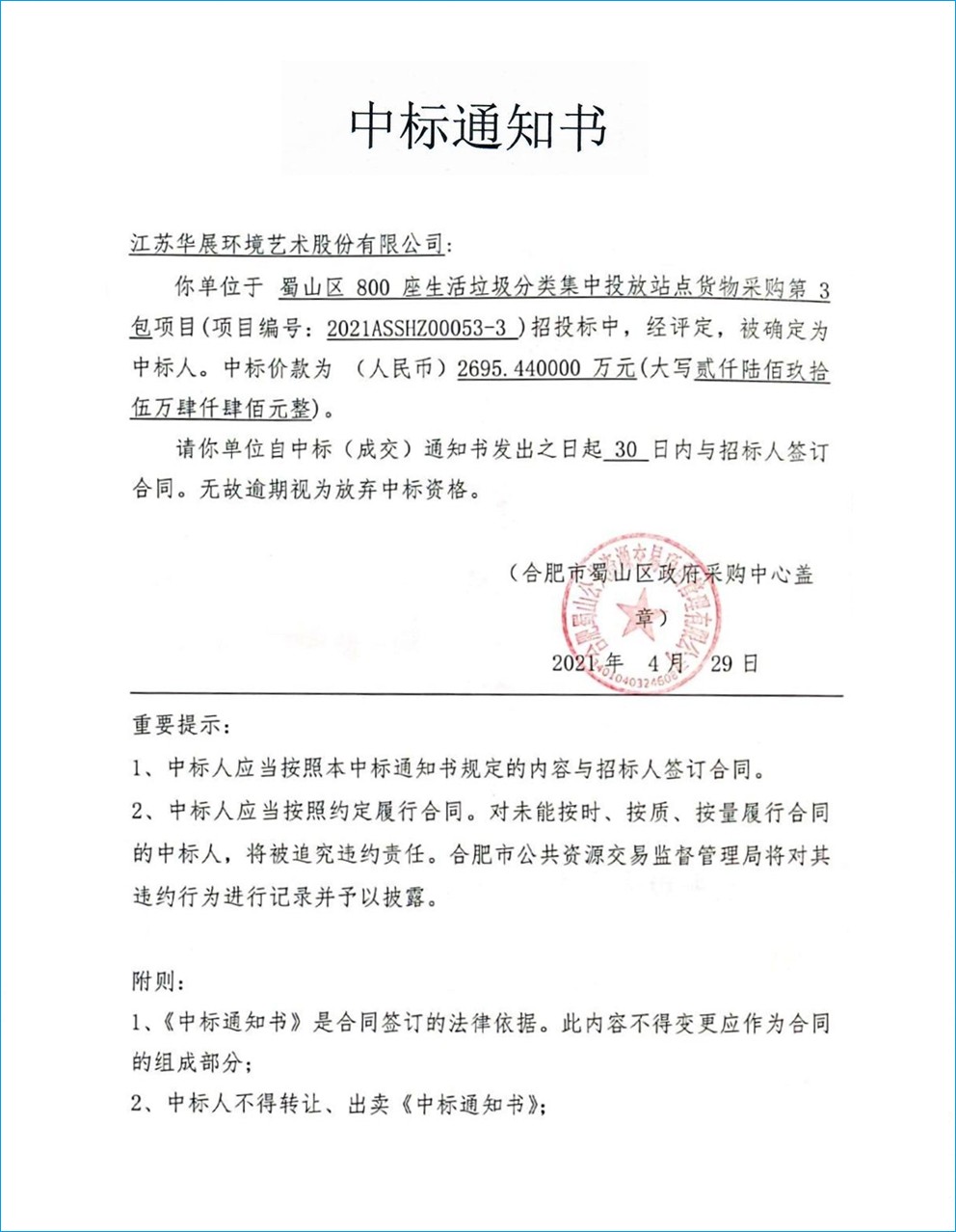 【中標(biāo)通知】江蘇省南京江北新區(qū)泰山街道小區(qū)生活垃圾分類收集點建設(shè)運營工程垃圾房、垃圾亭采購及相關(guān)服務(wù)項目
